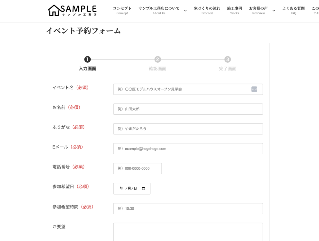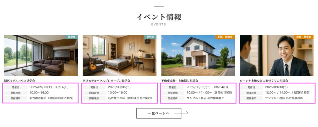 このデモサイトでは、工務店サイトに欠かせない「イベント情報」を効率よく発信・管理できるよう、「イベント」のカスタム投稿タイプを設けて対応しています。