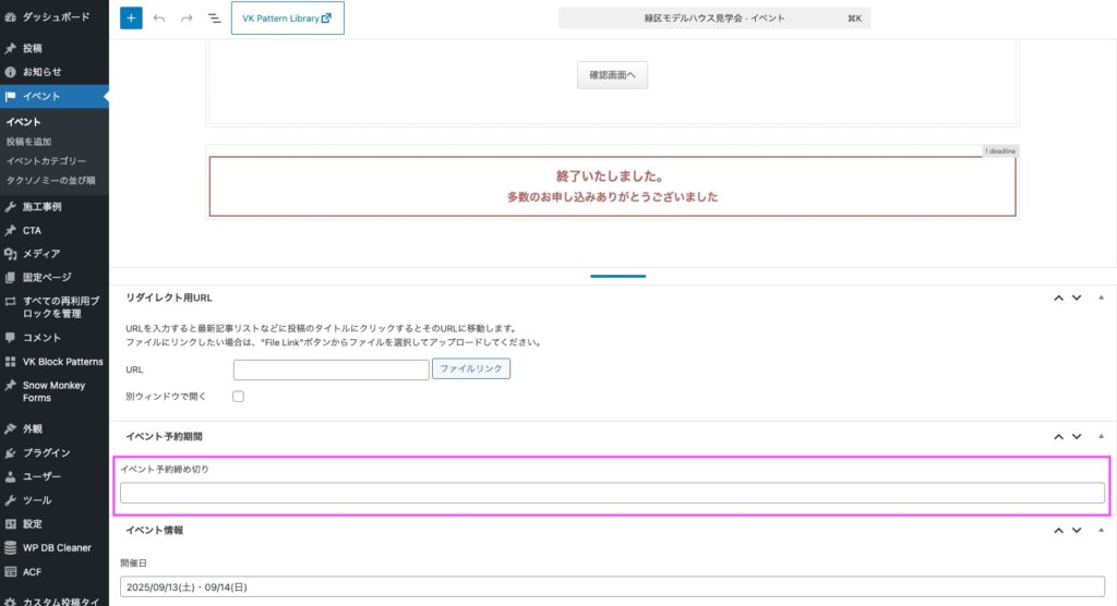 イベント予約フォームの募集締め切りの設定方法
