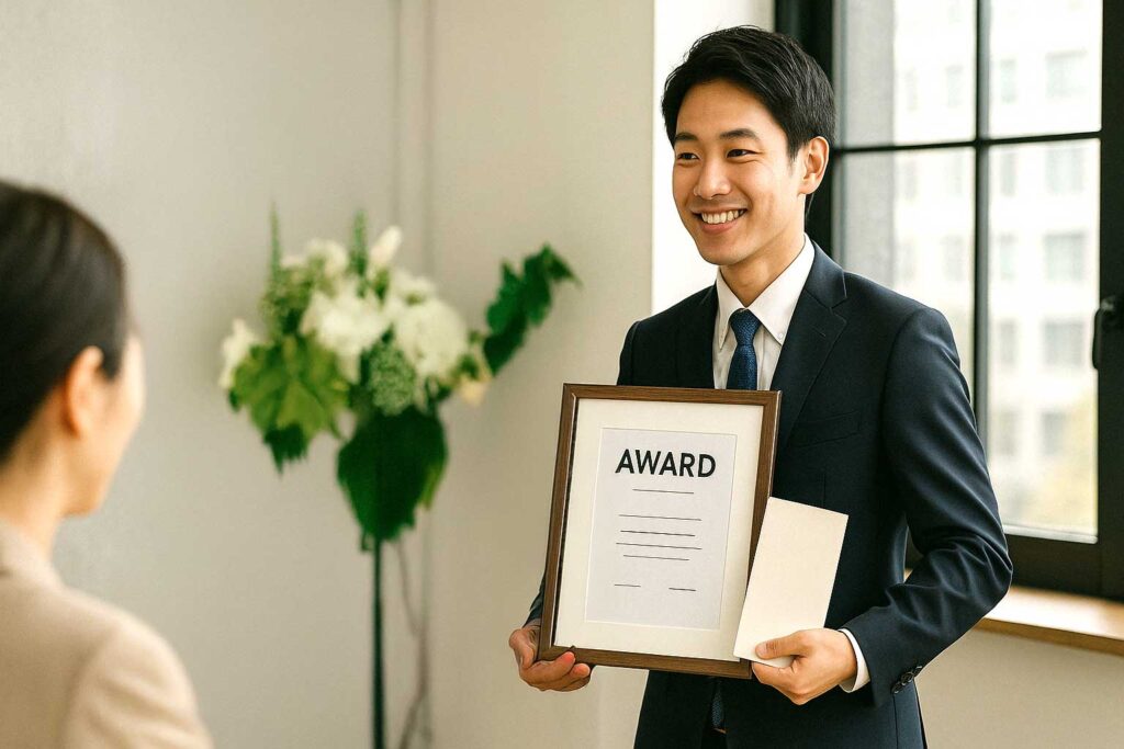 とくに会社に貢献した社員を、4半期ごとに表彰します。社長賞として表彰状と賞金が贈られます。